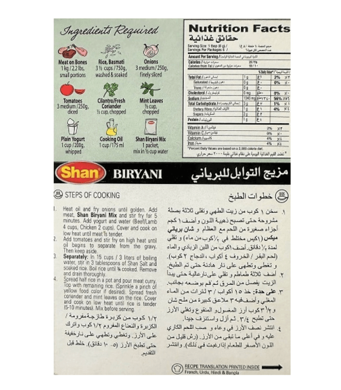 Shan Biryani Masala 100% halal. May contain: traces of Sulphite, Sesame, Mustard, Gluten and Tree Nuts, Suitable for Vegetarian, No artificial colours, No artificial preservatives.